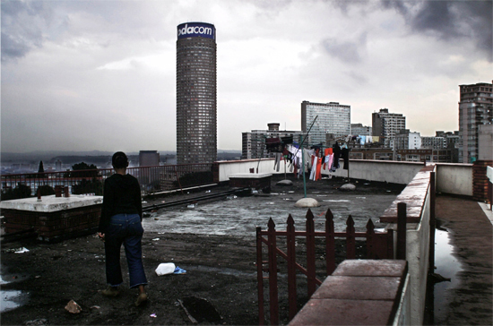 Guy Tillim. Al’s Tower, a block of flats on Harrow Road, Berea, overlooking the Ponte building, Johannesburg, 2004. Pigment print on cotton paper. Courtesy of the artist and the International Center of Photography
