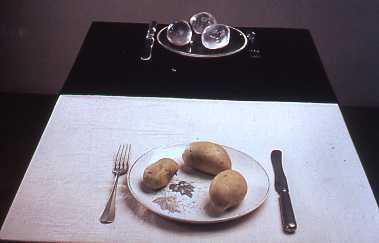 Analogy IV, 1972, Fourth versionWooden table with three natural potatoes on a Hartford ceramic plate, metal fork and knife on a white linen tablecloth; three carved potatoes in solid transparent acrylic on a plate, knife and fork all made of transparent acrylic resin, on a black velvet tablecloth, 75 x 55 x 100 cm. Private collection. Photo: Oscar Balducci.